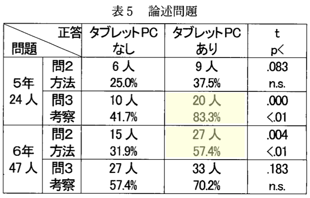 色付けした部分で特に「タブレットPCあり」の方が正答率が高くなるという結果に。